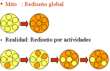 En realidad, es imposible rediseñar una empresa desde cero, pues la empresa debe seguir funcionando. Lo que se hace es rediseñar en oleadas, como vimos antes. Cada oleada cambia un grupo de actividades relacionadas. Al final, puede pasar que haya actividades que queden sin reformar pues no hace falta cambiarlas. |