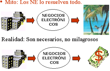 Finalmente, existe el falso mito que los negocios electrónicos resuelven todos los problemas de la empresa. Este mito es impulsado por los consultores o vendedores de E-business que presentan esta área como la panacea empresarial definitiva (haga clic en la figura para una explicación)